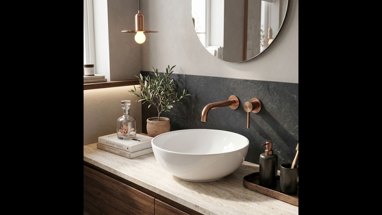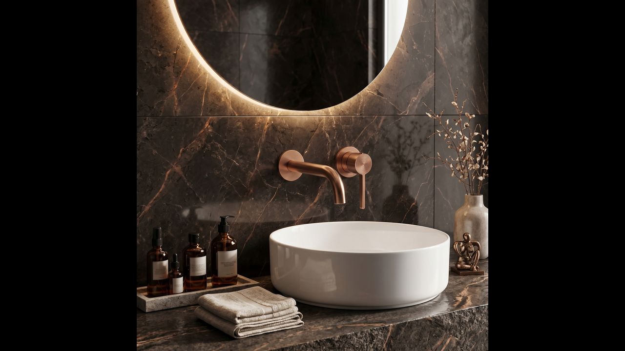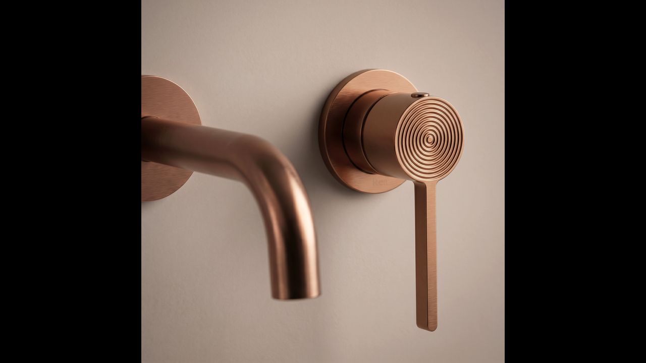 Bateria umywalkowa podtynkowa Foster w kolorze szczotkowanej miedzi to nowoczesne rozwiązanie, które pozwala na całkowite ukrycie elementów przyłączeniowych w ścianie. Dzięki temu strefa umywalki zyskuje minimalistyczny wygląd i dodatkową przestrzeń na blacie.