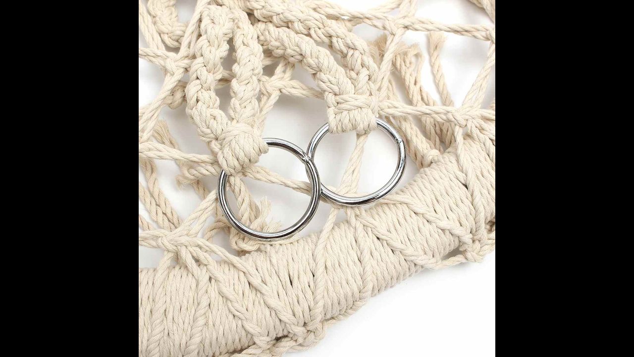 Wysokiej jakości podwieszana huśtawka w stylu boho została wykonany z 2 metalowych obręczy oraz wytrzymałego na naprężenia sznurka w postaci splotu. Oparcie, zostało wyposażone w 4 osobne liny, które dają możliwość zawieszenia na jednym lub na 2 hakach.