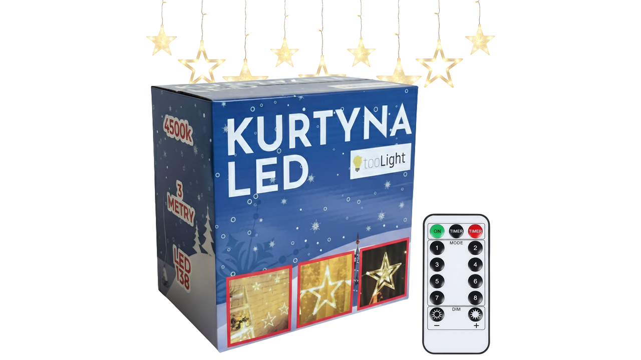 Do zestawu dołączony jest pilot zdalnego sterowania, umożliwiający włączenie oraz wyłączenie, rozświetlenie lub ściemnienie, a także tryby migotania/świecenia całej kurtyny.
