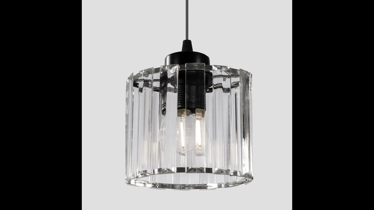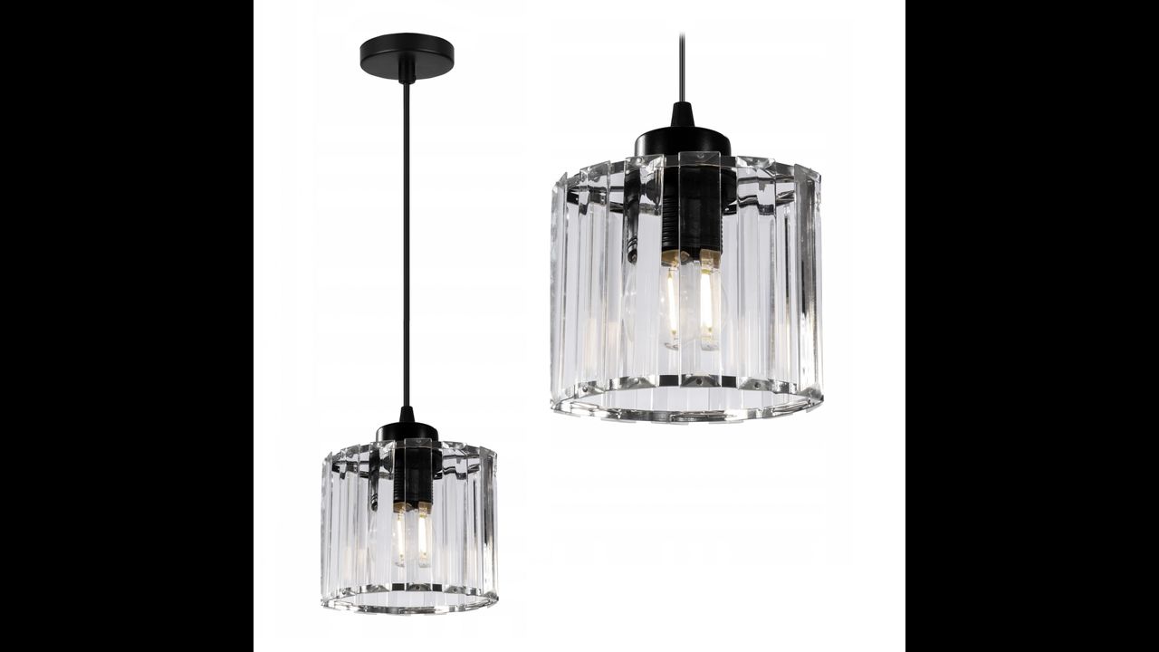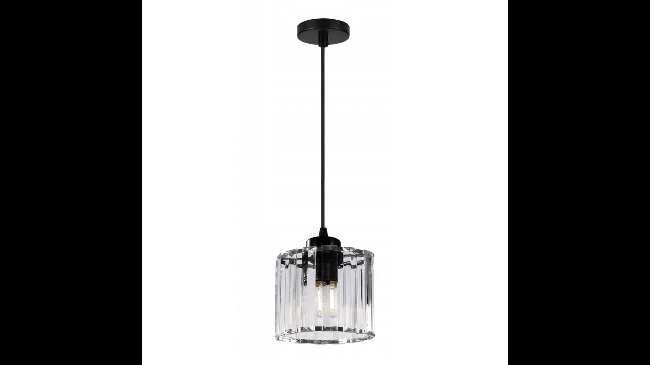 Lampa posiada klosz, przewody oraz metalową maskownica przy suficie.Wyposażona została w najpopularniejszy gwint przeznaczony do żarówki E27.