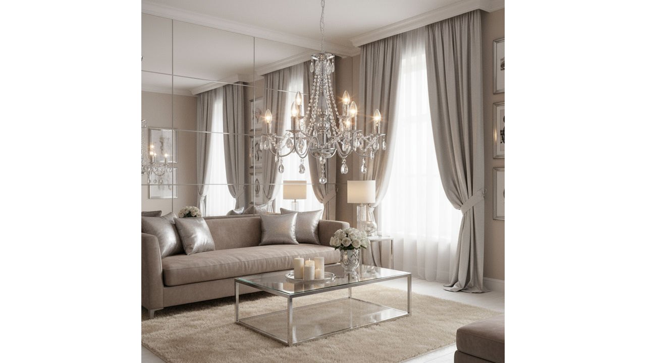 Lampa doskonale sprawdzi się w salonie, jadalni, holu czy sypialni, gdzie stanie się nie tylko źródłem światła, ale i ozdobą pomieszczenia. Dzięki klasycznemu układowi ramion oraz dekoracyjnym łańcuszkom i zawieszkom, model ten idealnie wpisuje się w styl glamour, klasyczny lub nowoczesny z nutą elegancji.
