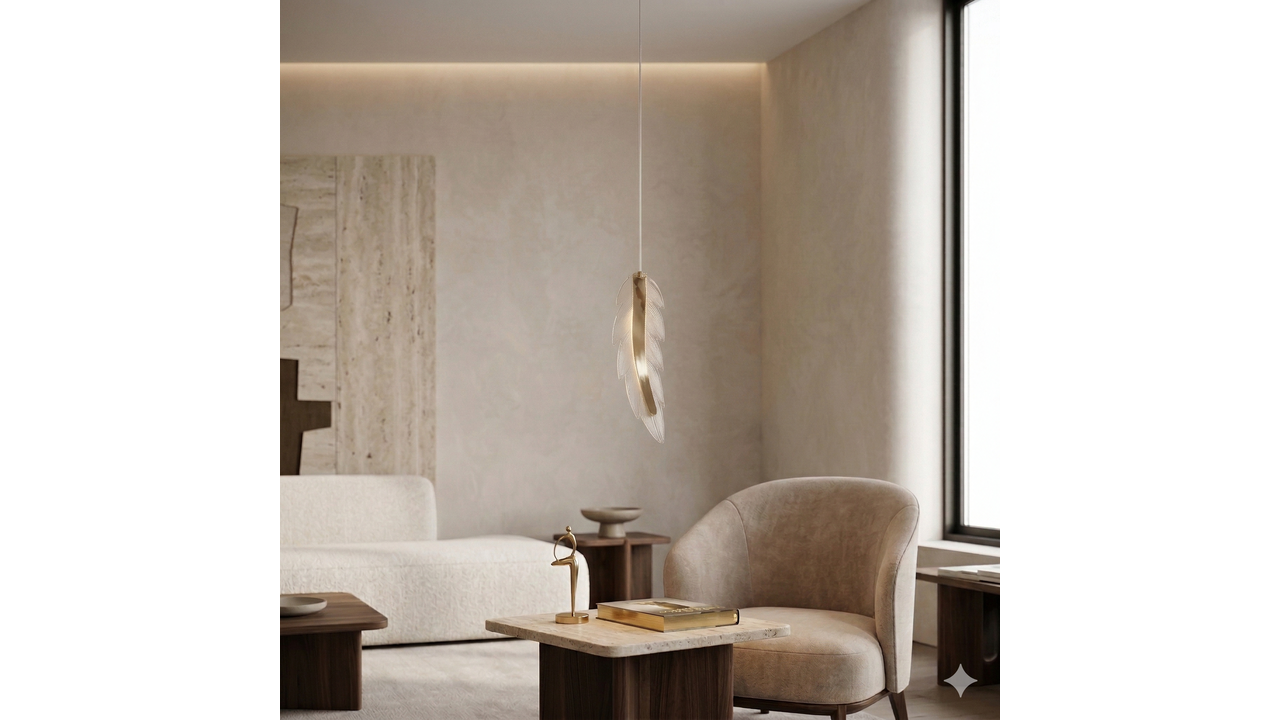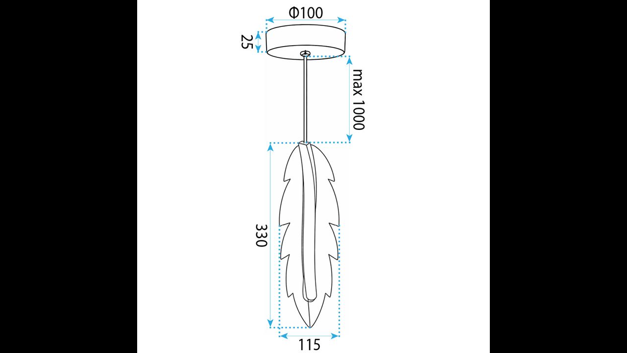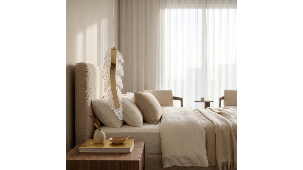 Subtelna lampa wisząca o dekoracyjnej formie inspirowanej piórem, która łączy lekkość wizualną z eleganckim wykończeniem. Sufitowy element montażowy oraz centralna część lampy zostały wykonane z metalu w złotym kolorze, co nadaje całości wyrafinowanego charakteru i podkreśla nowoczesny styl oprawy. Transparentna część świetlna z tworzywa sztucznego delikatnie rozprasza światło, tworząc przyjemny efekt i dodając wnętrzu subtelnej dekoracyjności.