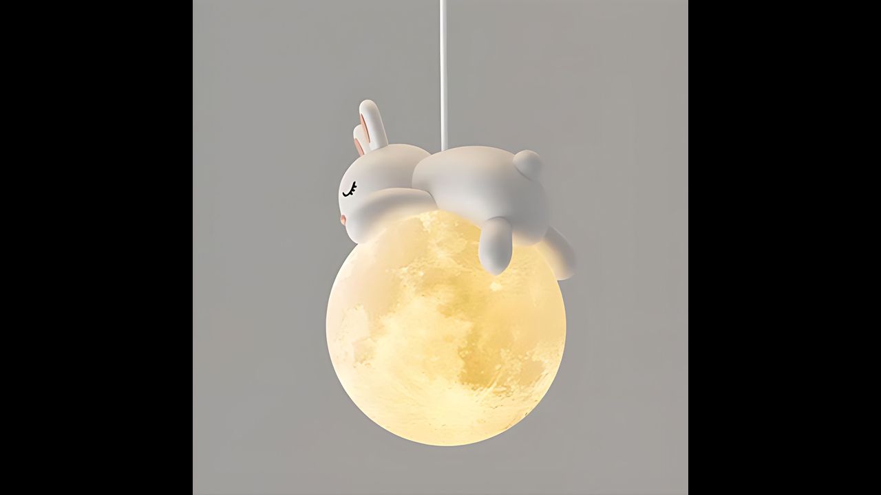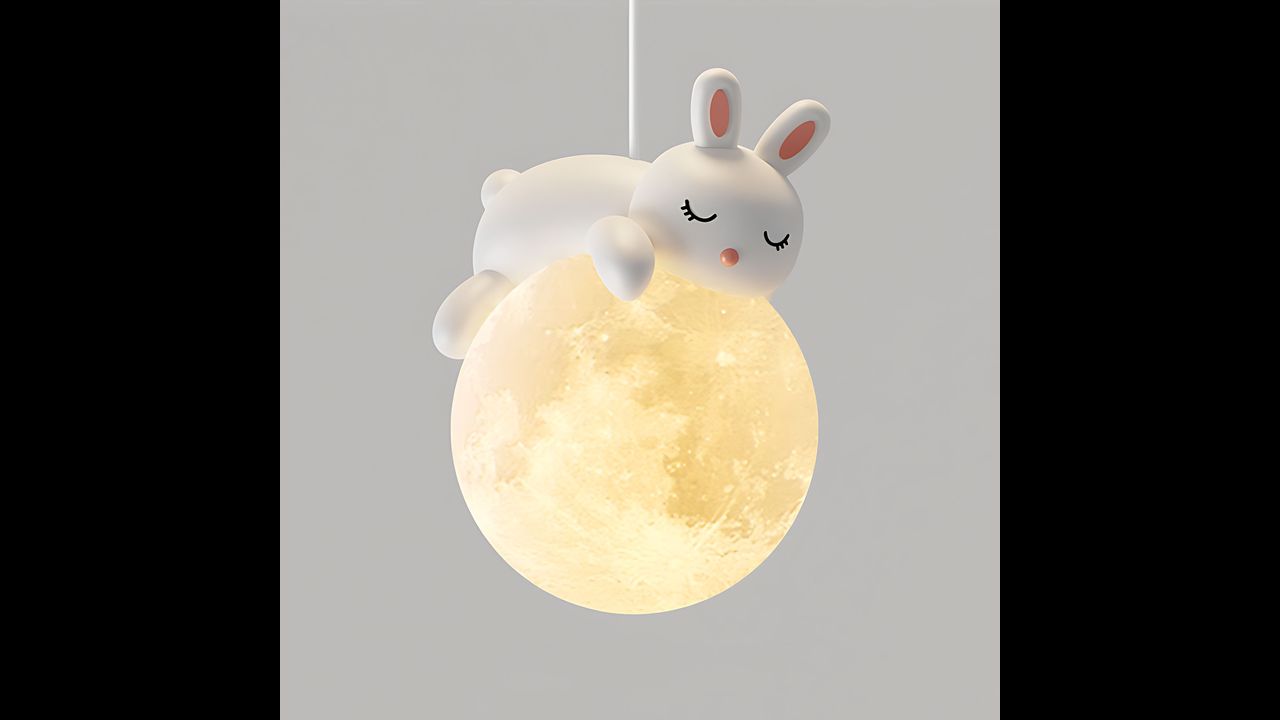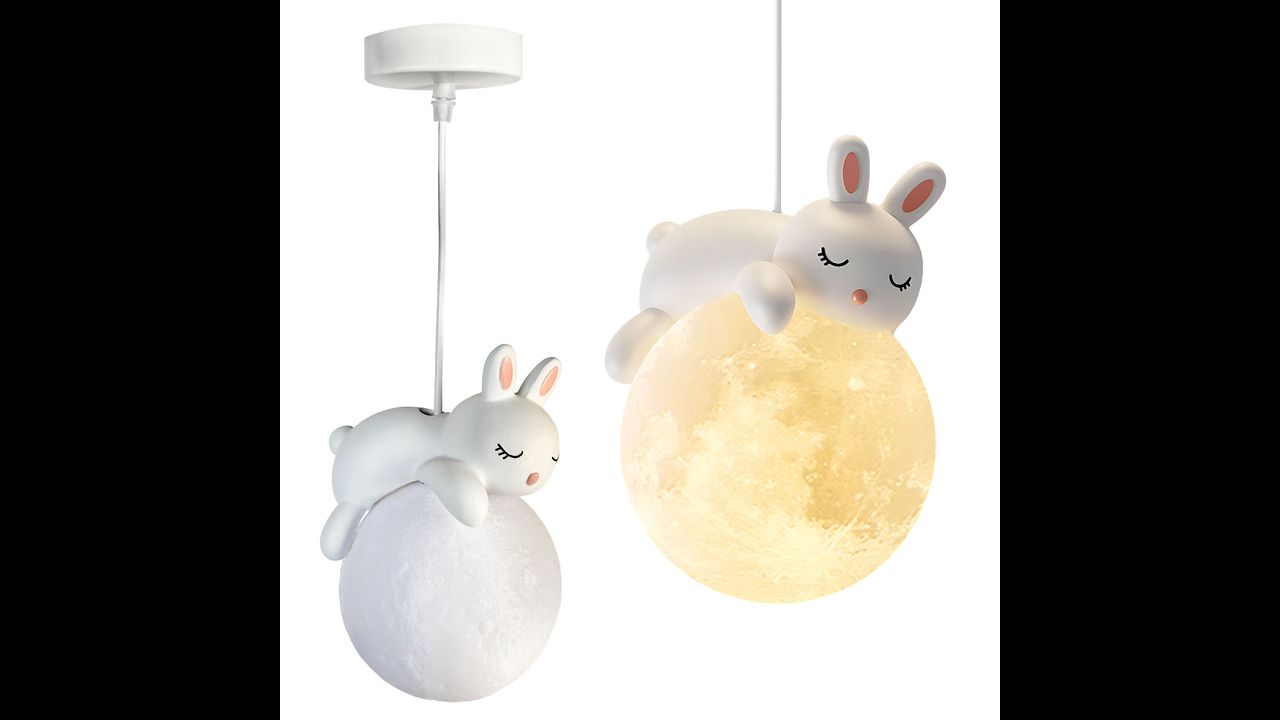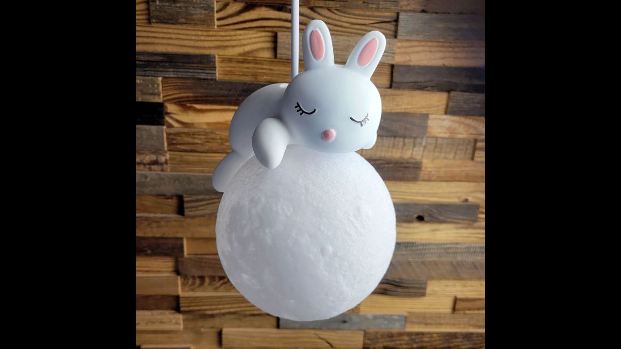 Klosz lampy został zaprojektowany w formie okrągłego księżyca o fakturowanej powierzchni, która po podświetleniu subtelnie imituje wygląd prawdziwego księżyca. Na jego powierzchni spoczywa uroczy króliczek z zamkniętymi oczami, dodając lampie wyjątkowego uroku i delikatności. Całość wykonano z tworzywa, dzięki czemu konstrukcja jest lekka, trwała i bezpieczna w codziennym użytkowaniu. Figurka króliczka malowana ręcznie.