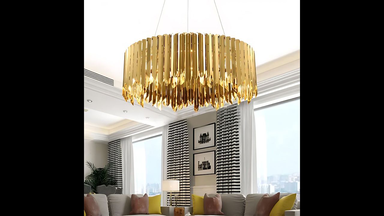 Designerska lampa w kolorze złota wykonana w całości z polerowanych na lustro metalowych płytek, które dzięki gładkiej złotej powierzchni odbijają światło, tworząc ciekawy efekt wizualny.