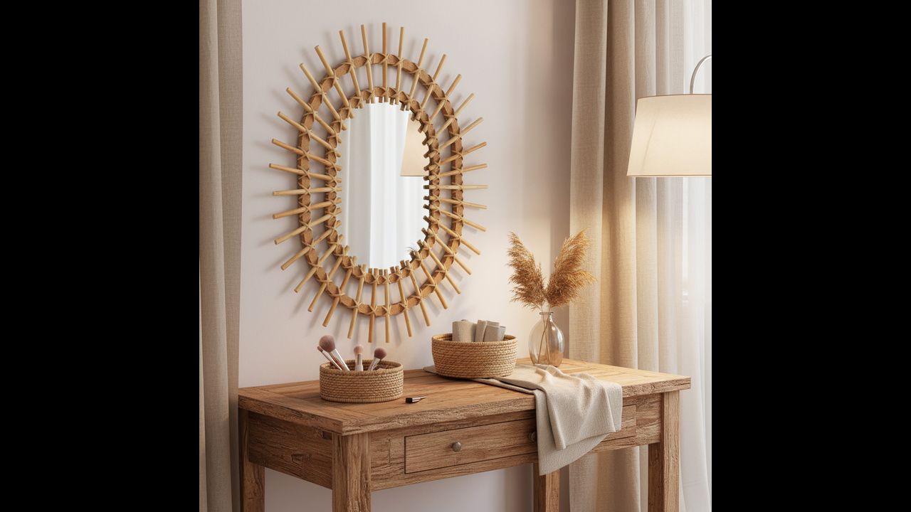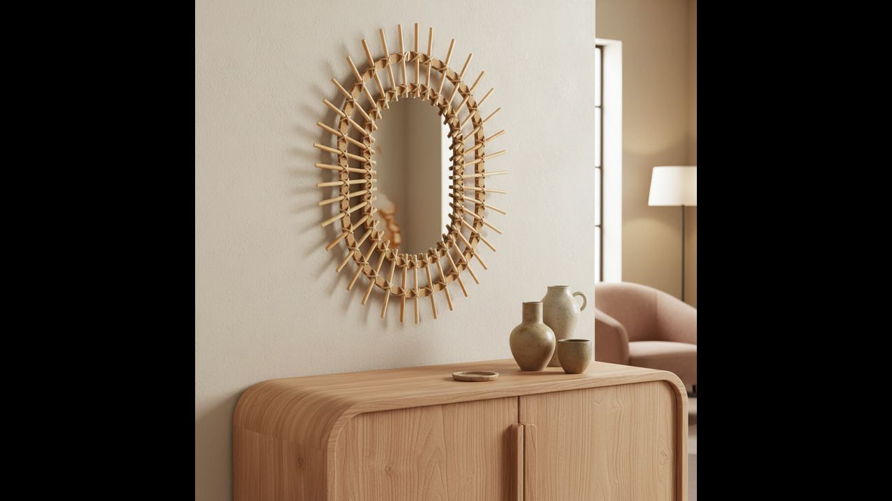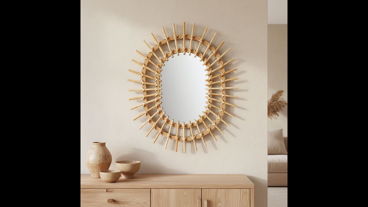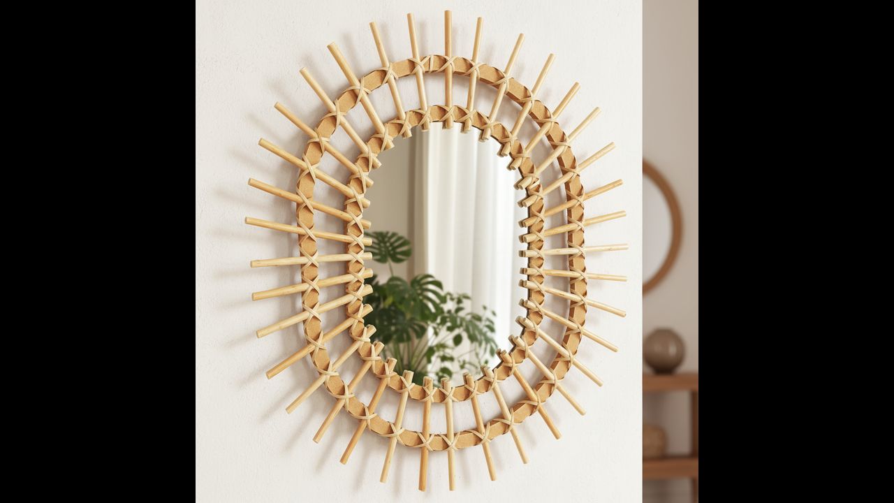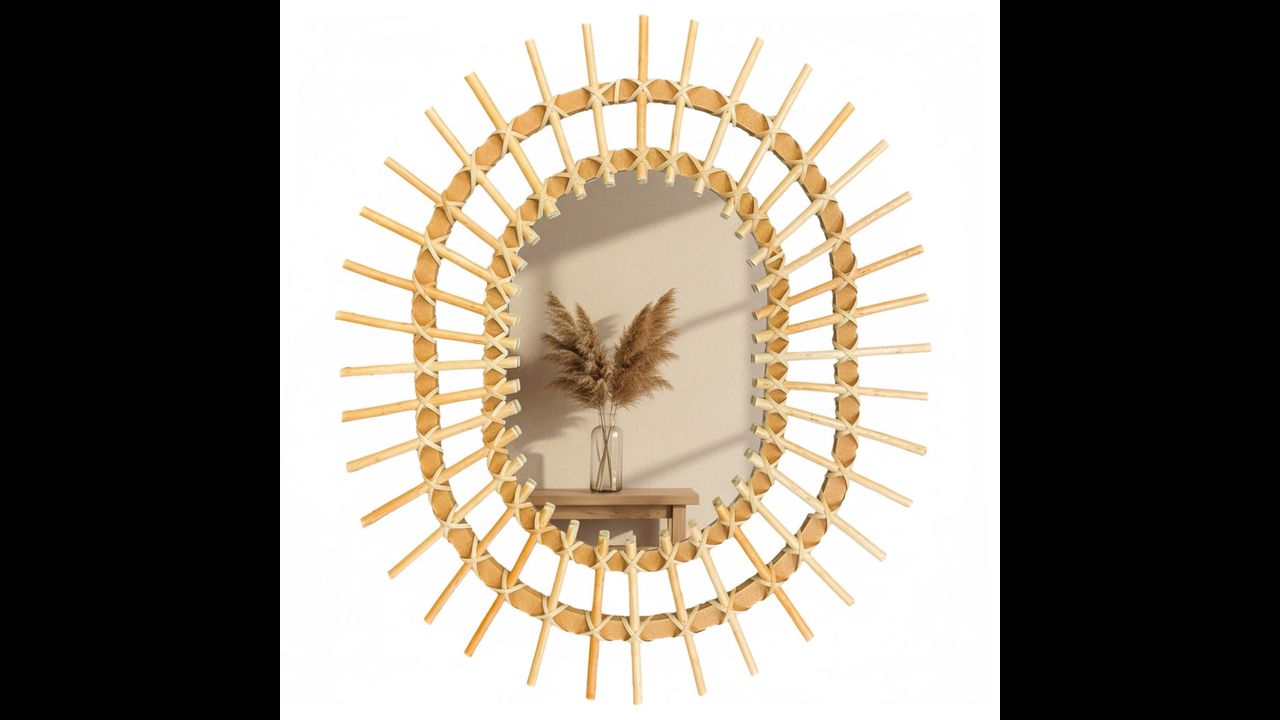 Szukasz oryginalnej dekoracji, która ożywi Twoje ściany? Wybierz owalne lustro ścienne utrzymane w modnym stylu Boho. Jego unikalna rama wykonana z naturalnego bambusa układa się w efektowny, promienisty wzór, który wprowadza do wnętrza ciepło i harmonię. To idealny dodatek dla osób ceniących naturalne materiały i niebanalne wzornictwo.