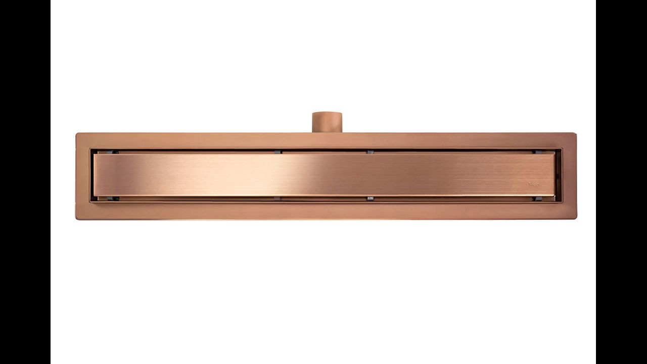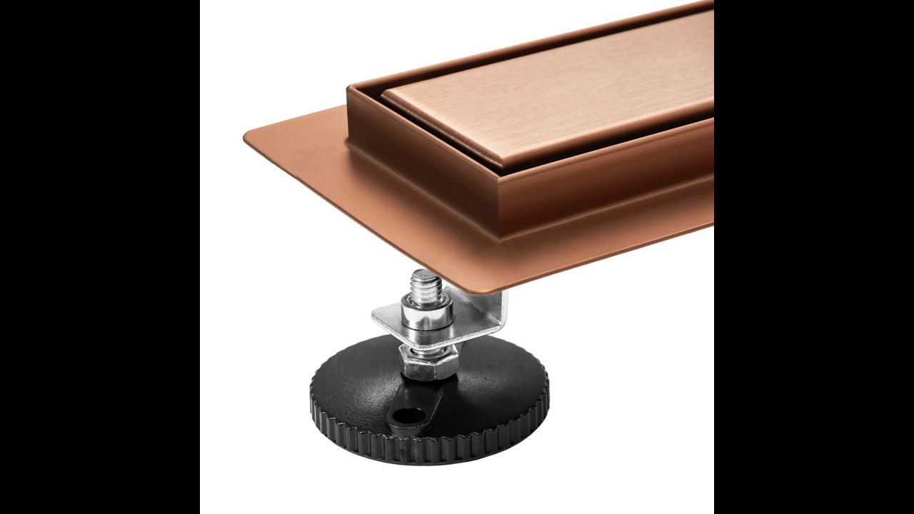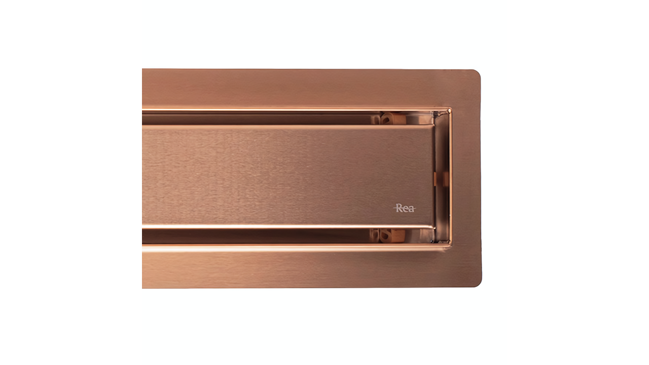 Maskownica w odpływie jest obustronna – z jednej strony miedź szczotkowana, a z drugiej przystosowana do wklejenia płytki, co pozwala na idealne dopasowanie do aranżacji wnętrza. Dzięki takiemu rozwiązaniu odpływ pozostaje dyskretny, a cała strefa prysznicowa nabiera minimalistycznego i eleganckiego charakteru.
