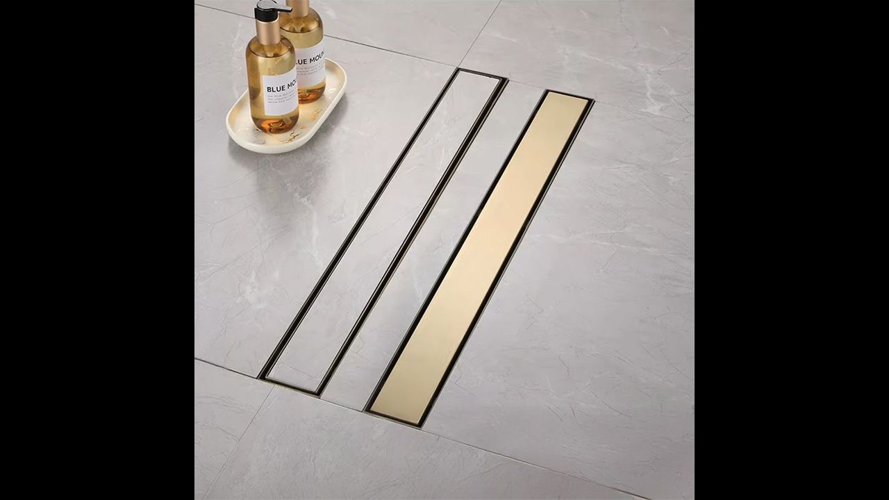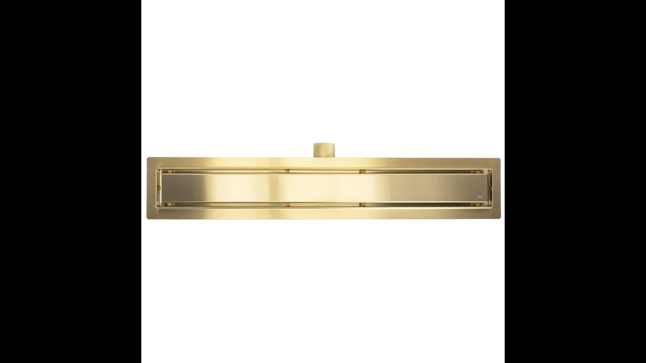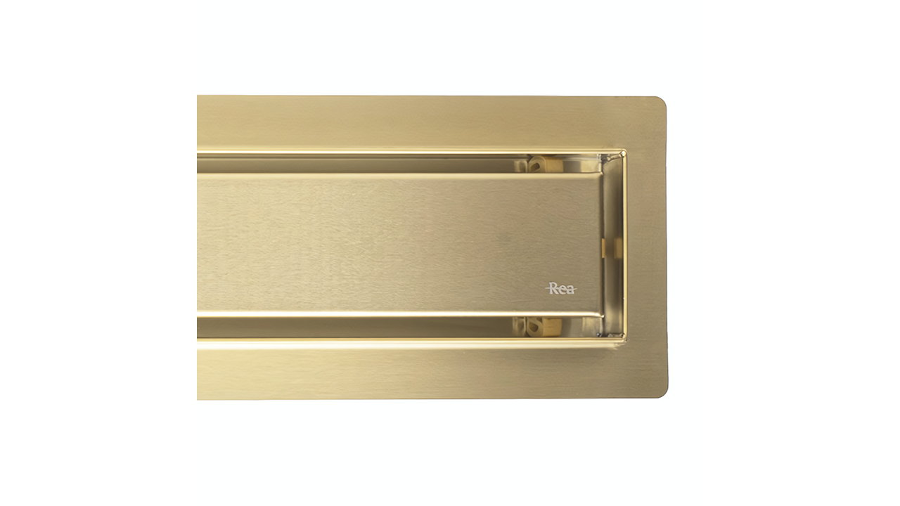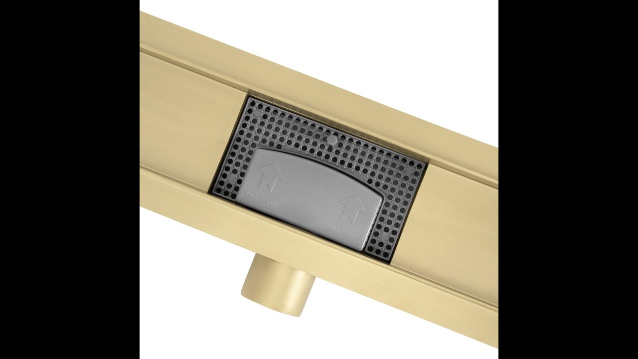 Maskownica w odpływie jest obustronna – z jednej strony złota szczotkowana, a z drugiej przystosowana do wklejenia płytki, co pozwala na idealne dopasowanie do aranżacji wnętrza. Dzięki takiemu rozwiązaniu odpływ pozostaje dyskretny, a cała strefa prysznicowa nabiera minimalistycznego i eleganckiego charakteru.