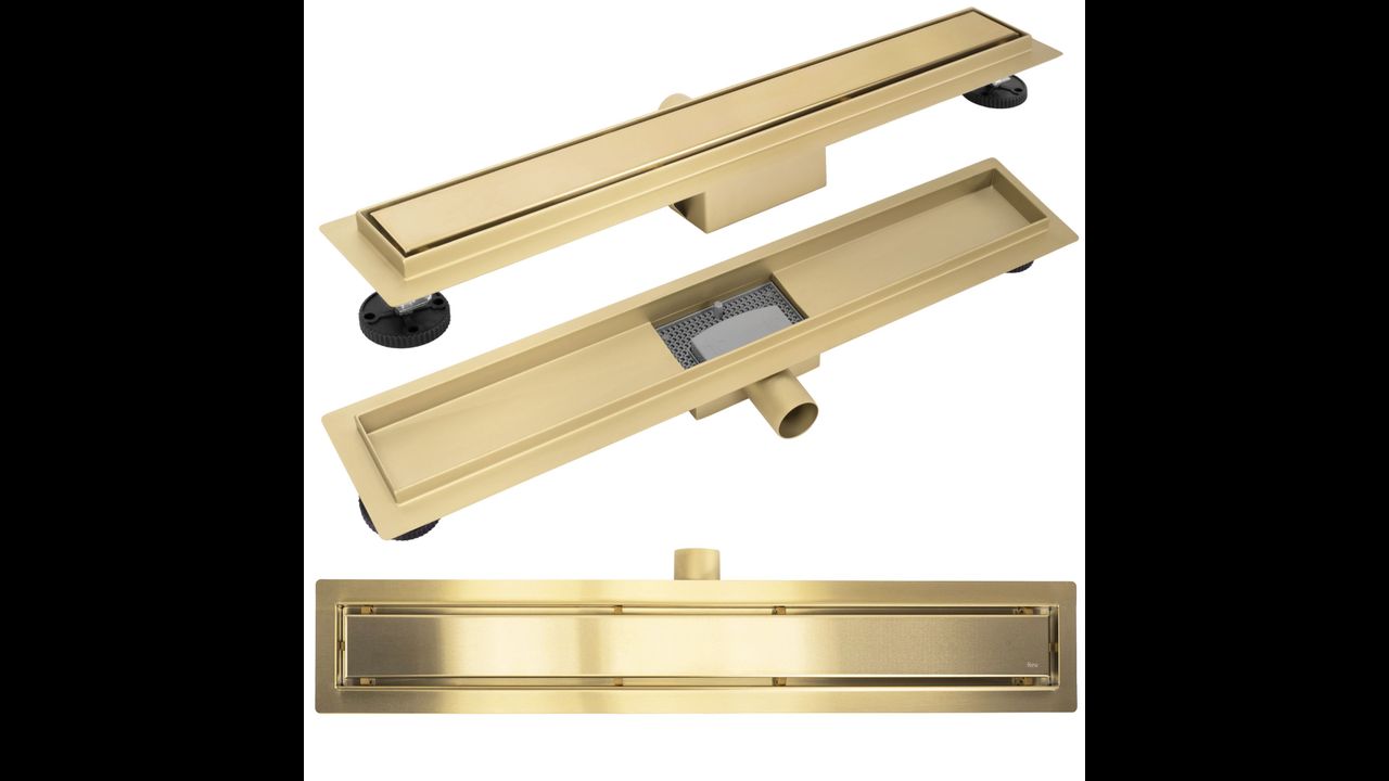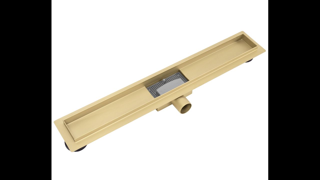 Maskownica w odpływie jest obustronna – z jednej strony złota szczotkowana, a z drugiej przystosowana do wklejenia płytki, co pozwala na idealne dopasowanie do aranżacji wnętrza. Dzięki takiemu rozwiązaniu odpływ pozostaje dyskretny, a cała strefa prysznicowa nabiera minimalistycznego i eleganckiego charakteru.
