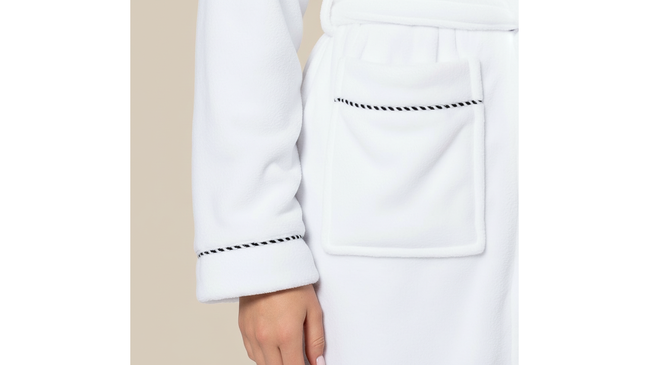 Miękki, pluszowy szlafrok. Idealny towarzysz chłodnych poranków i długich wieczorów. Długość do kolan sprawiają, że świetnie się sprawdzi szczególnie jesienią i zimą. Dołączony do szlafroka pasek pozwala regulować jego szerokość.