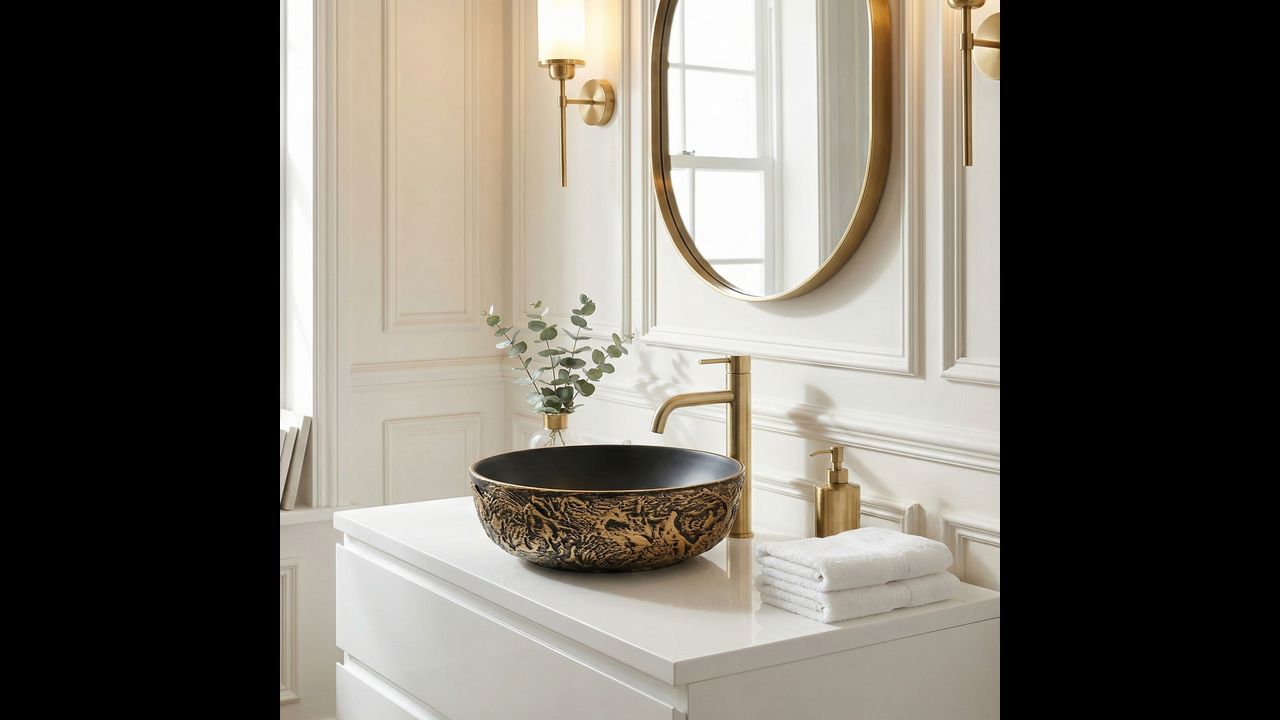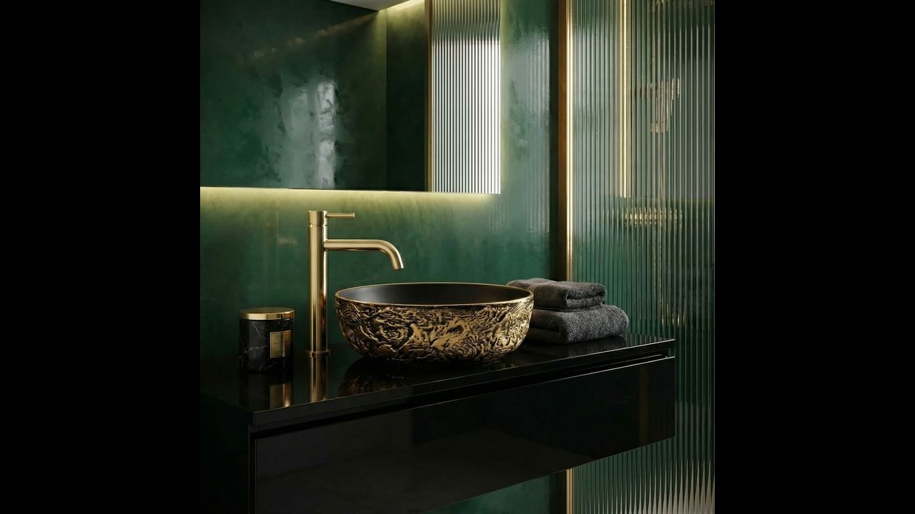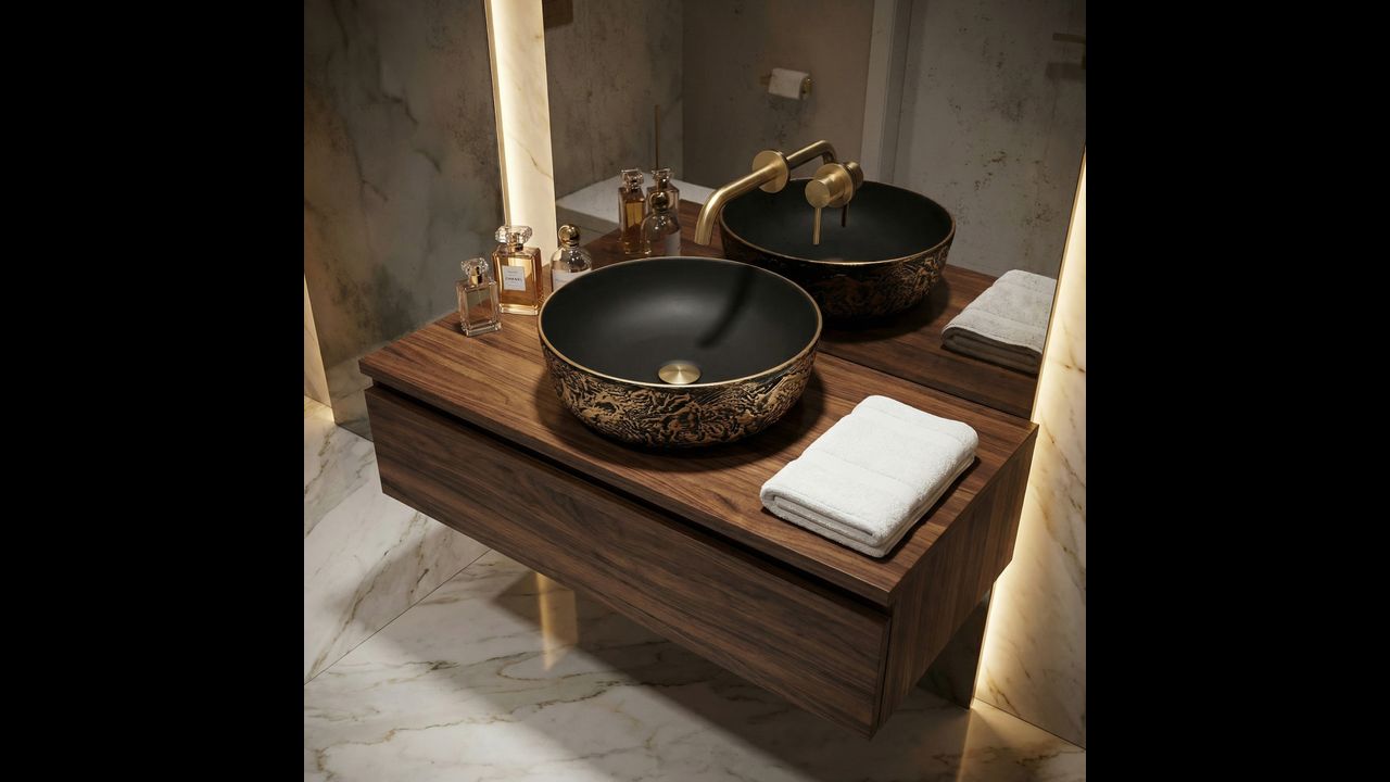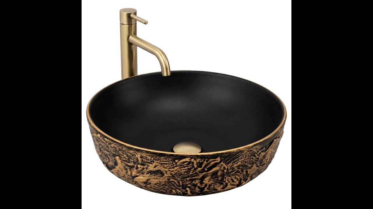 Umywalka ceramiczna Babilon Gold będzie doskonałym wyborem do odważnych wnętrz w stylu industrialnym, glamour czy modern dark, stając się wyrazistym i luksusowym punktem centralnym Twojej strefy myjącej.