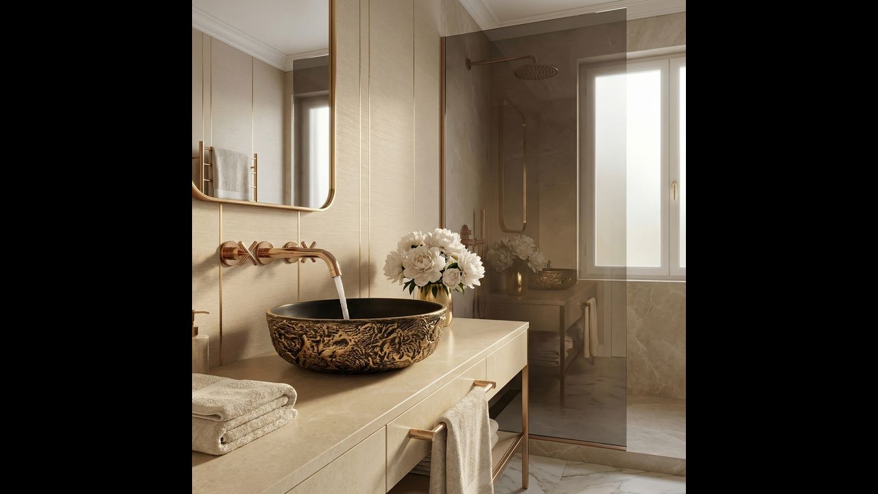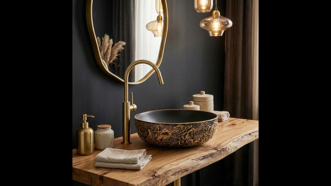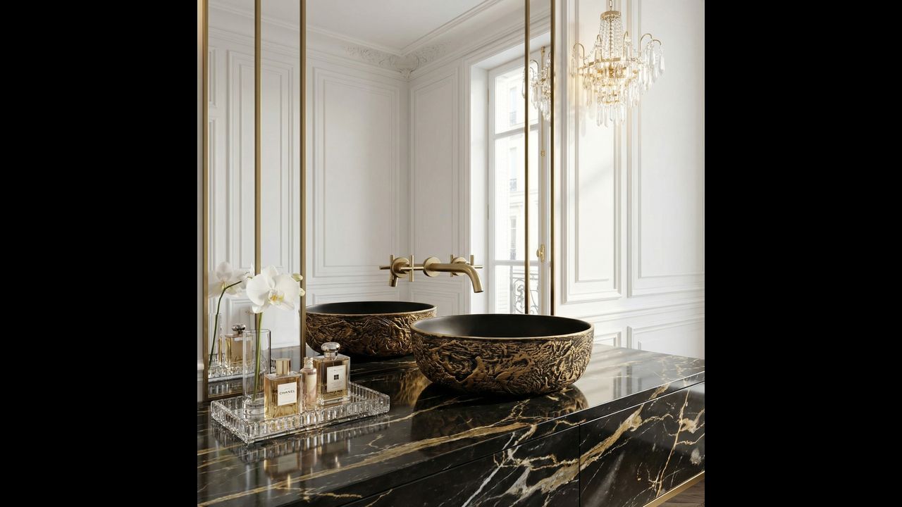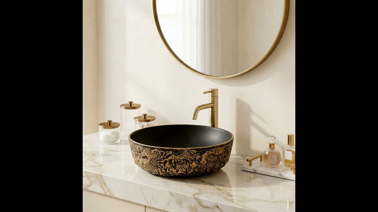 Umywalka ceramiczna Babilon Gold będzie doskonałym wyborem do odważnych wnętrz w stylu industrialnym, glamour czy modern dark, stając się wyrazistym i luksusowym punktem centralnym Twojej strefy myjącej.