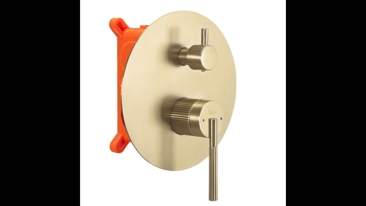 Zestaw prysznicowy podtynkowy Agron w złotym szczotkowanym wykończeniu wyróżnia się nowoczesnym, minimalistycznym designem z subtelnymi ryflowaniami, co dodaje mu wyjątkowego charakteru.